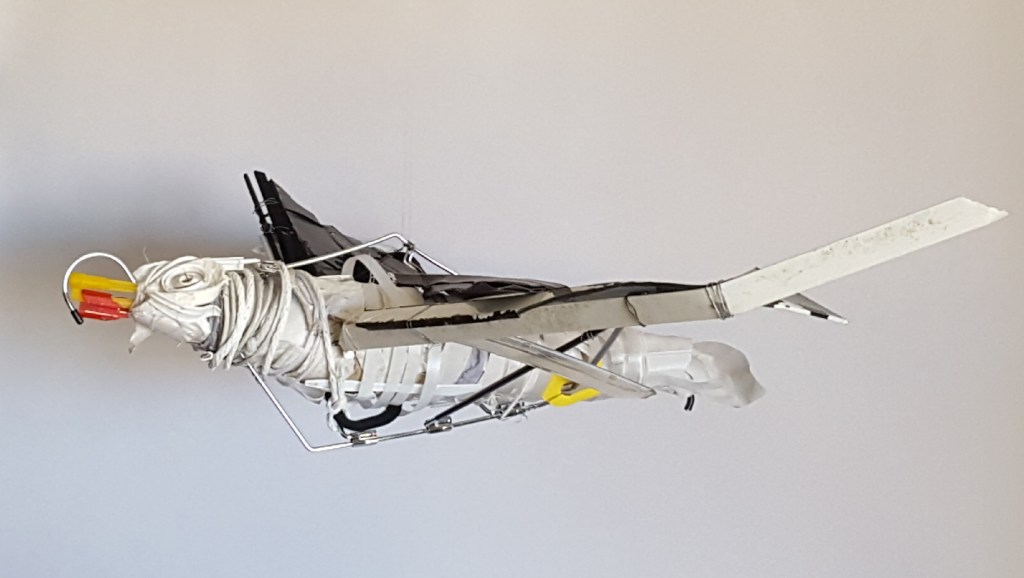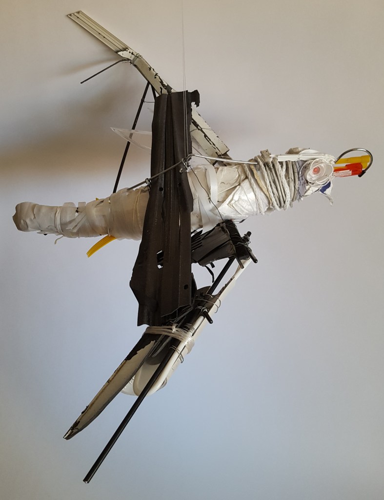 Assembled from trash gathered in Central Park including 4 hangars and parts, plastic food containers, knives, disposable lighter, cable, plastic strapping, rope, scrunchies, caps, plastic and paper fragments