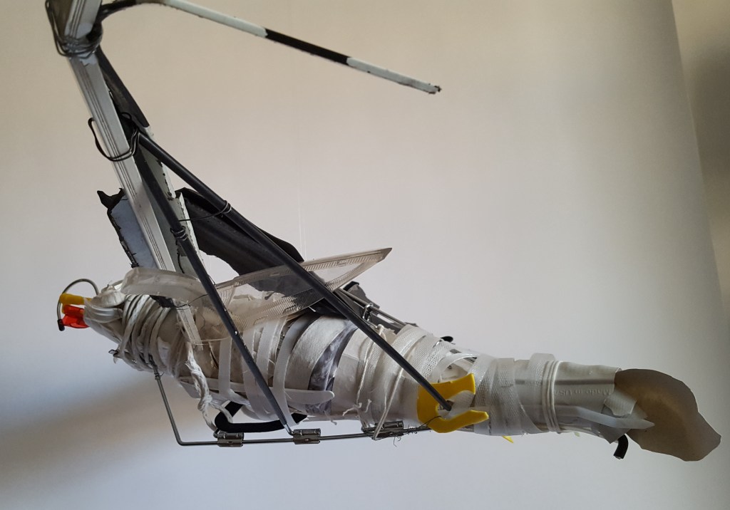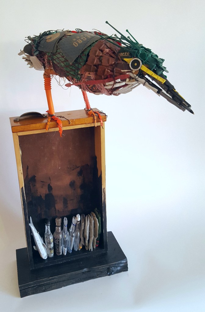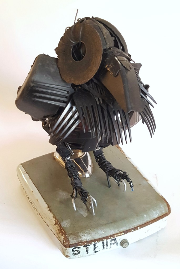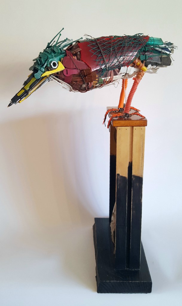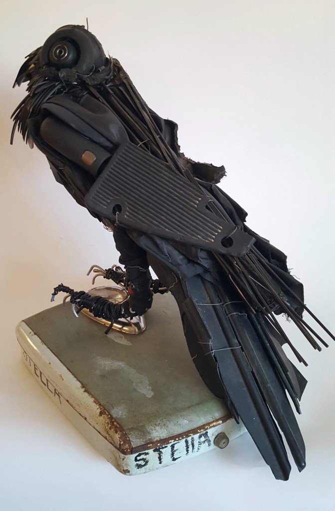 Assembled from trash gathered in Central Park including: bathroom scale, umbrella, plastic forks and knives, bike helmet fragments, sunglasses, earbuds, cords, tire parts, grinder wheel, wires