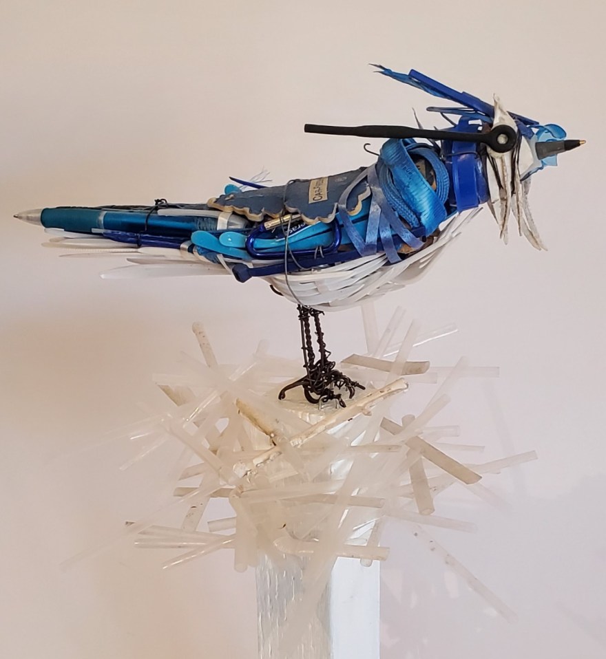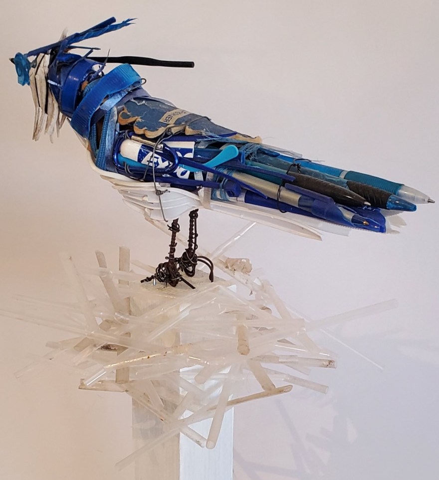 Assembled from trash gathered in Central Park including: Car air freshener, ballpoint pens, plastic forks, plastic straws, spring clip
