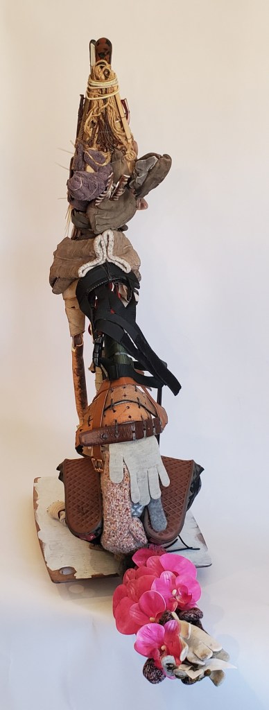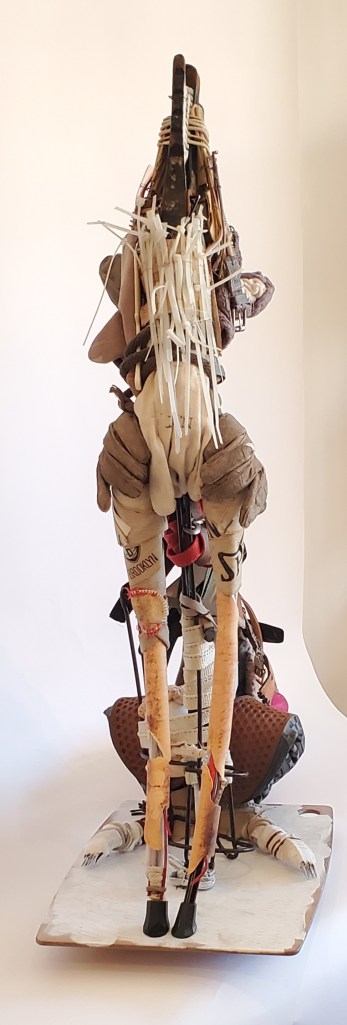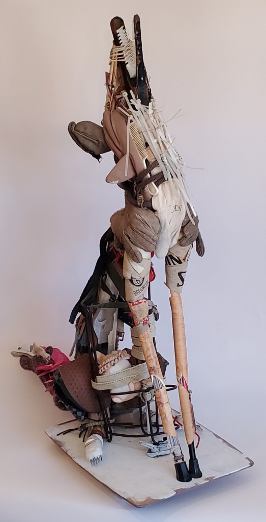 (42in x 32 x 16) Assembled from trash including: Iron umbrella stand, enameled metal clamp, combs, zip-ties, eyeglass earpieces, gloves, mittens, leashes, PVC pipe, plastic caution stanchion, buckles, bels, sneakers, hair elastics, scrunchies, baseball basketball parts, plastic forks, socks, cardboard, conduit sheath, artificial orchid frond, palette, wood, plush toy, geo-tag, metal wire